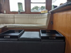 Onboard space is always considered prime real estate, dually important is functionality and multipurpose use. At any given time we have 2 – 3 baskets used as storage and to easily move for workspace.