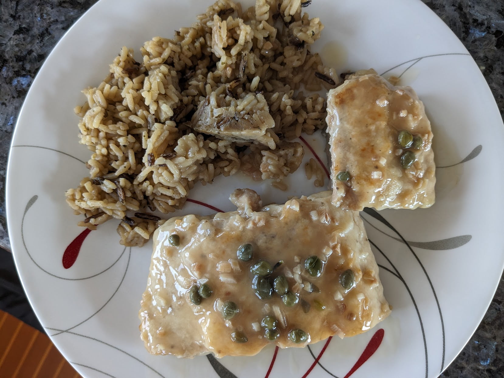 In the skillet pan, saute garlic for a few seconds. Add juice, broth, wine and whisk together. Add capers and thyme. Stir well. Slowly fold in your small bowl mixture. Simmer until thickened and add fillets. Serve hot.
