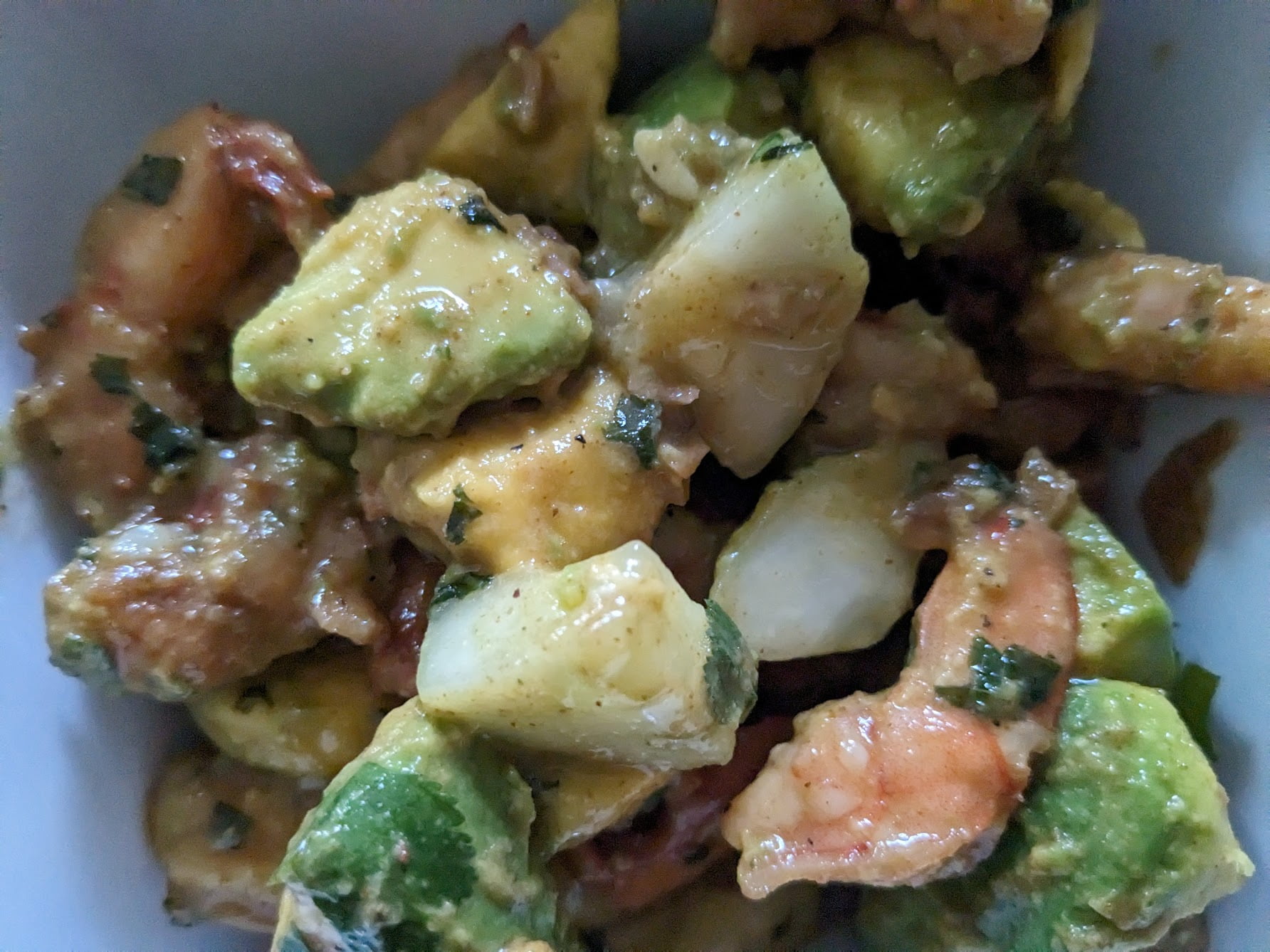 Cut and cube avocado, add to cucumber mixture and pour shrimp into bowl. Mix well. Gently fold in additional cilantro. Serve cold or warm.