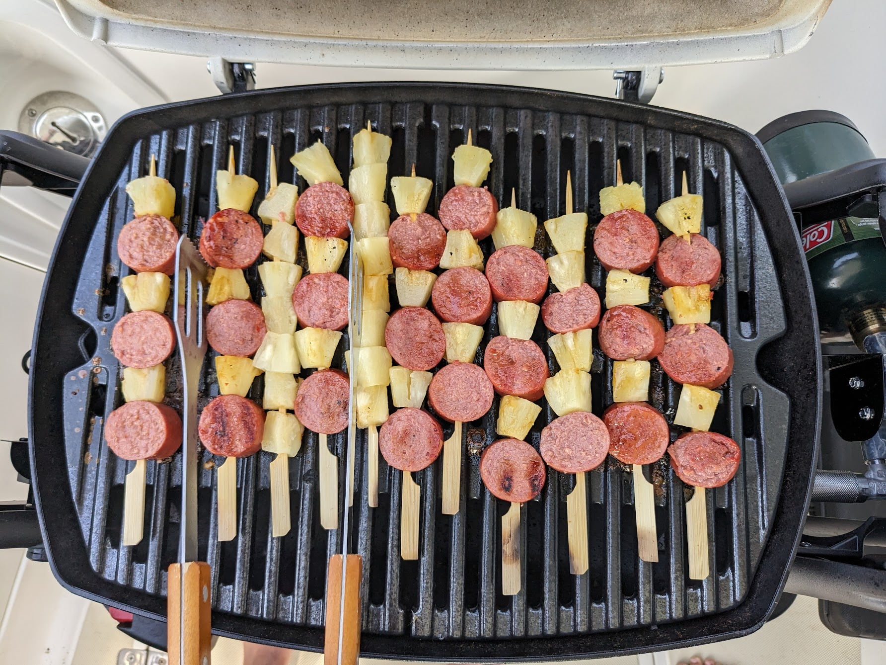 Cut kielbasa into bite size pieces, roughly 1/2 inches pieces and set aside. In a small basting bowl add and mix pineapple juice, sweet chili sauce, teriyaki sauce and set aside. Alternate kielbasa bites and pineapple chunks onto a wooden skewer. Once finished, place onto a hot grill baste with glaze opposing side, flip and baste with glaze. Serve warm.