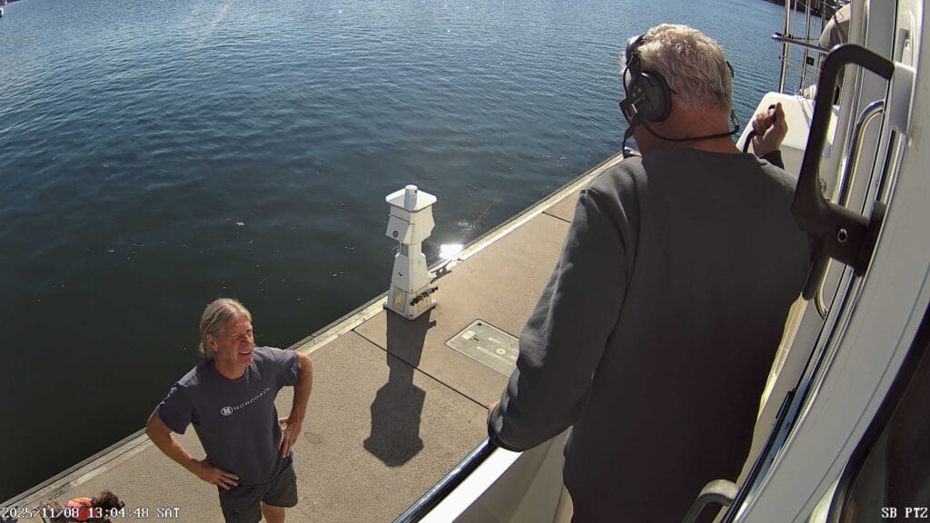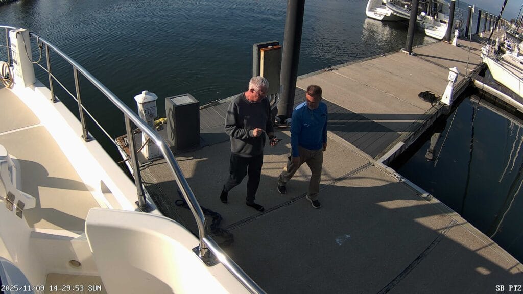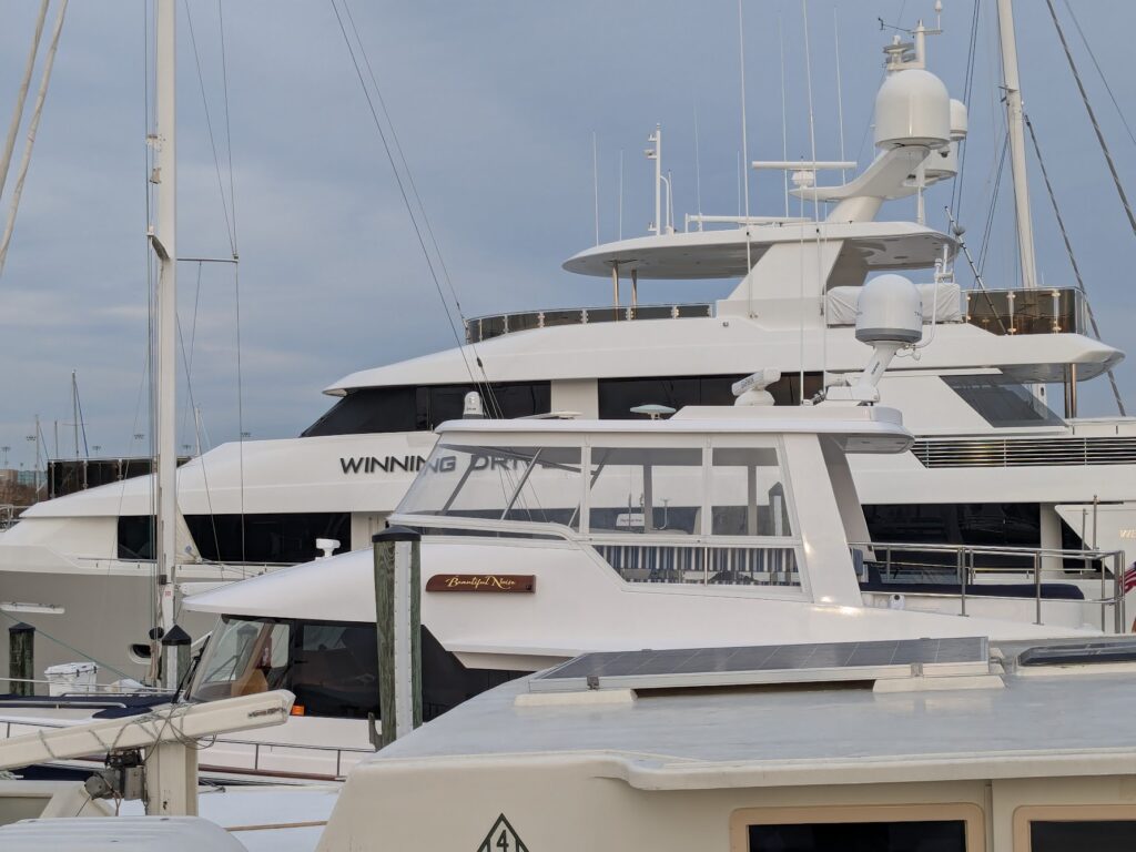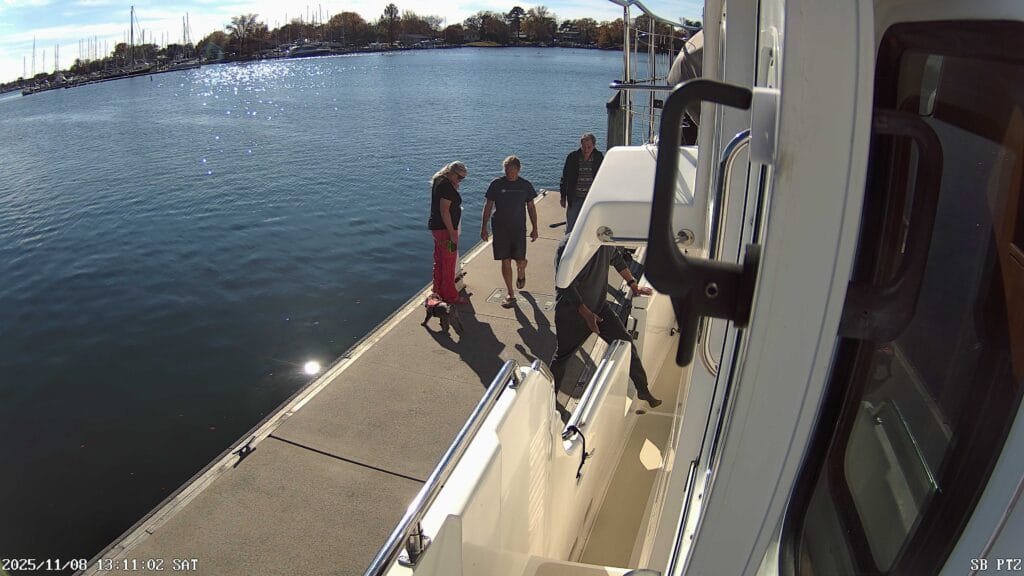 - Not sure when it happened but, our starboard neighbor M/V Mr Chips (79’9″ Lazzara Yacht) is gone and our view restored. Surprisedly, we must have slept through all the thruster movement and noise. Because the Delivery Captain heavily used thrusters docking. According to Jacques the benefit of hydraulic thrusters. Actually, according to our starboard security camera they began detaching around 5:30AM.