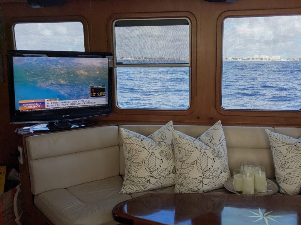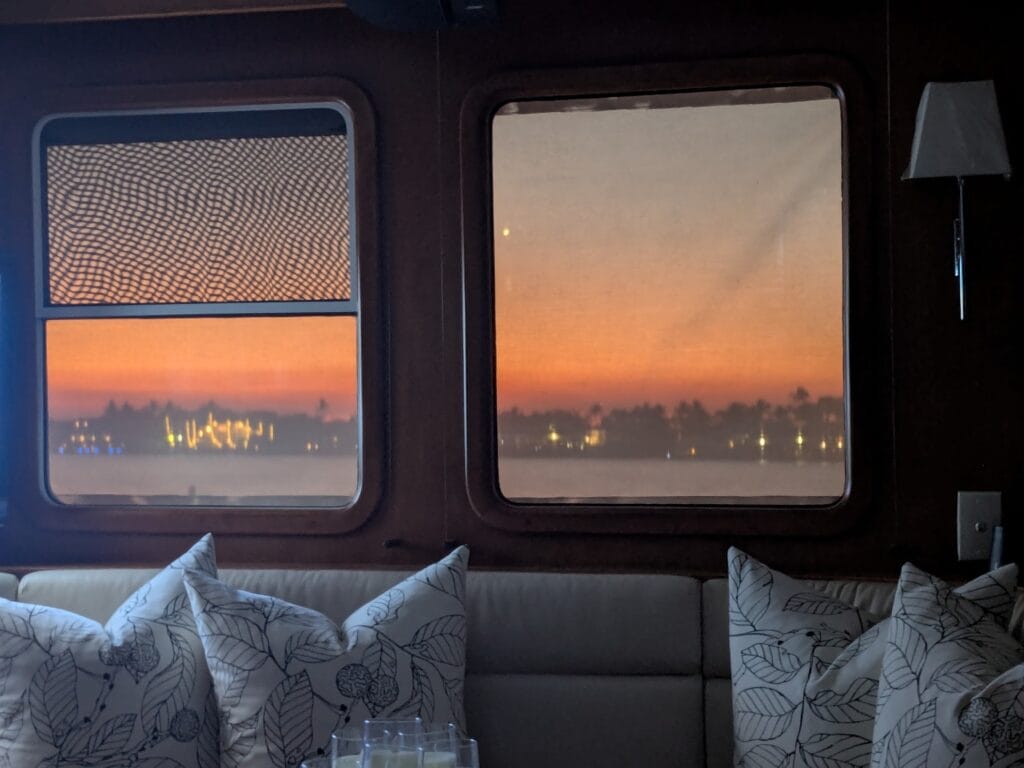 - With the water reflection the Pilothouse had us cooking like a rotisserie chicken in 84°F (outside 60°F), opening port side door wasn’t enough ventilation so we opened starboard door too. Absolutely, loving our retractable Phantom Screen doors!