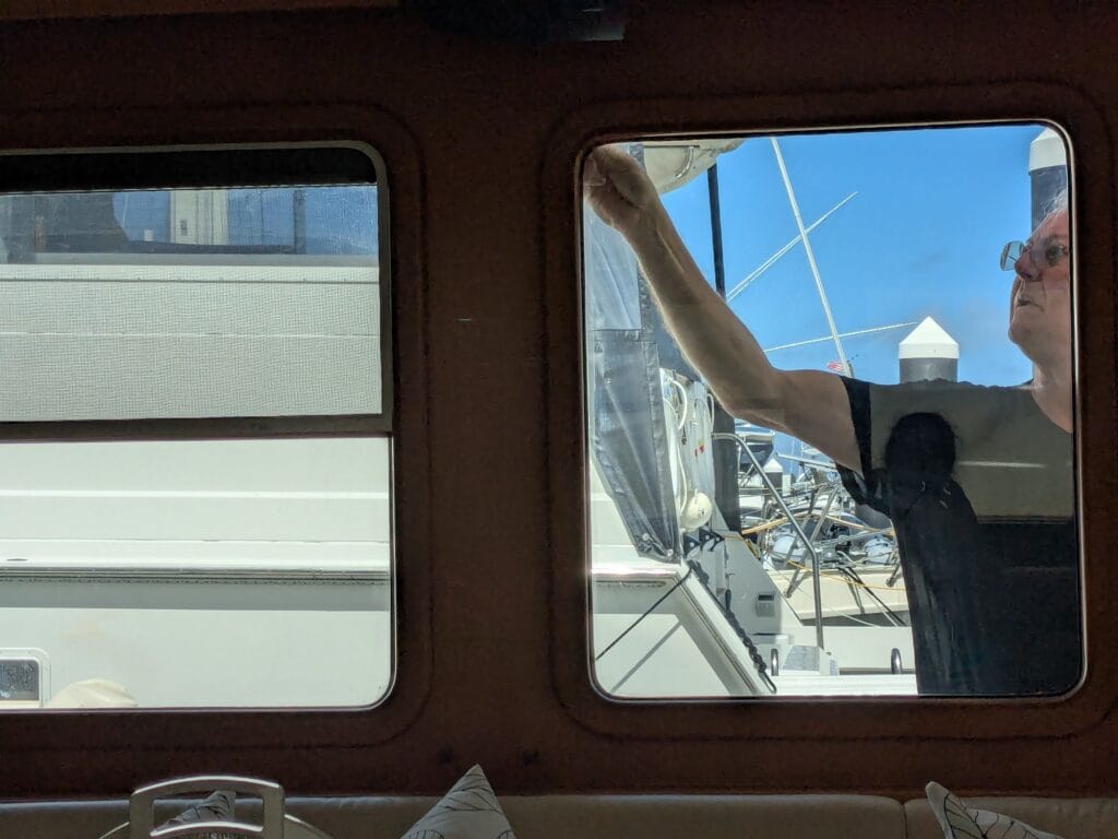 - Jacques finished covering the cockpit windows (2) with perforated vinyl. Only the port side windows (3) left to do whenever we can flip the boat around. Gosh, the salon is so much brighter and appears larger.
