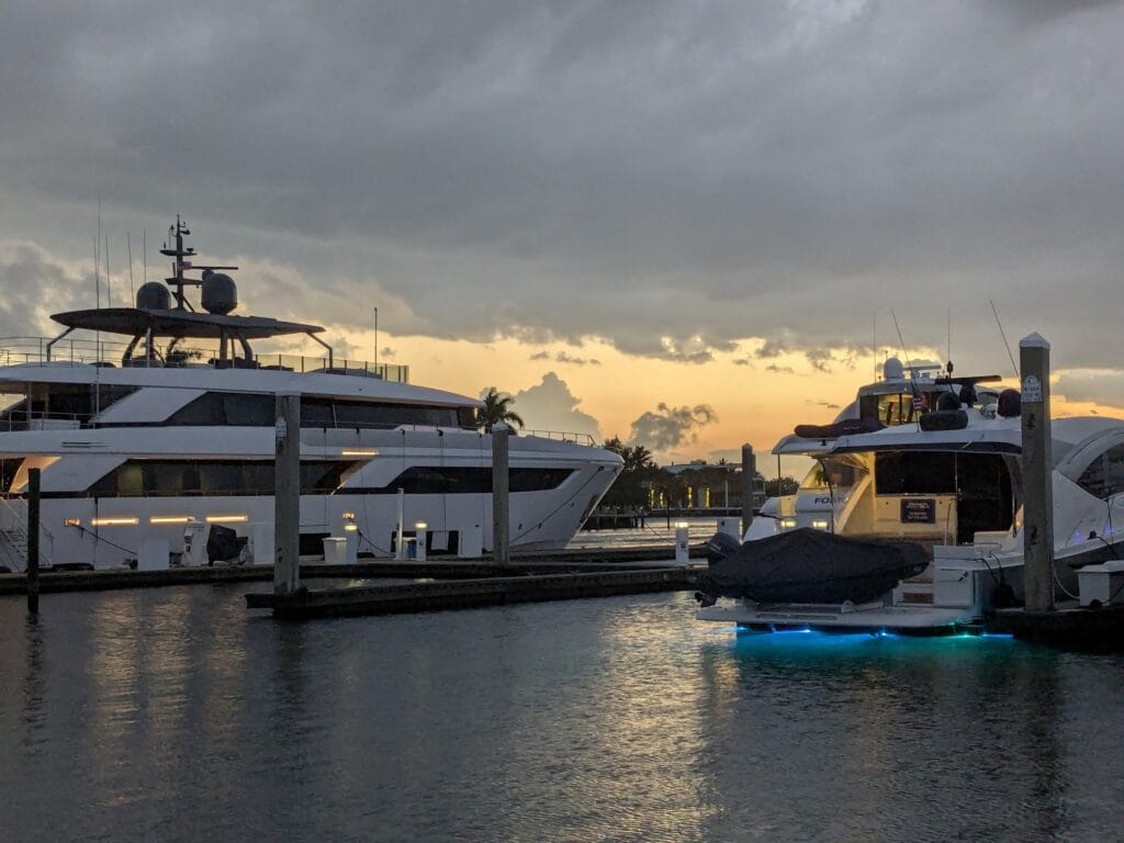 - A short cruise to Dania Beach, FL. On approach, there’s no signage from the water. Two docked mega yachts parked on either side of the haul out entrance/exit. Passing the mega yacht to our port side, had rented floating docks with four story high scaffolding. Crazy! At one point, to center ourselves in the sling, we had approximately six inches between us and them. Crazy! Clearing the corner was less than 2″. Crazy!